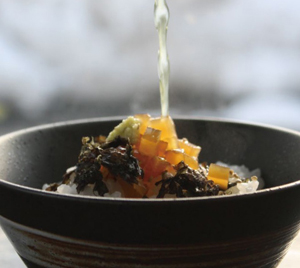 白いご飯に粗みじんにした菊丸と海苔、ゴマ、ワサビ。塩を一つまみ振り入れ、熱いお茶を注いで頂きます。高貴な味が食事の時間の時を止めます。