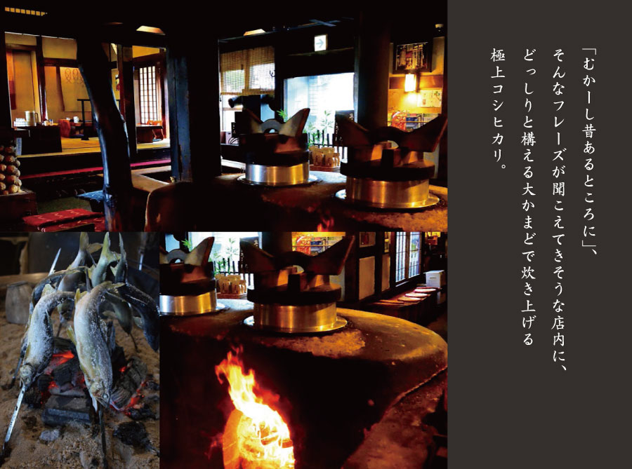 太り梁、囲炉裏、大かまどのある築300年以上の古民家、ゆったりとした時間の中で味わう日本一のかま炊きコシヒカリ。